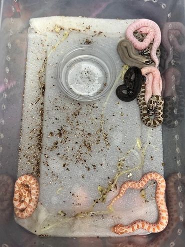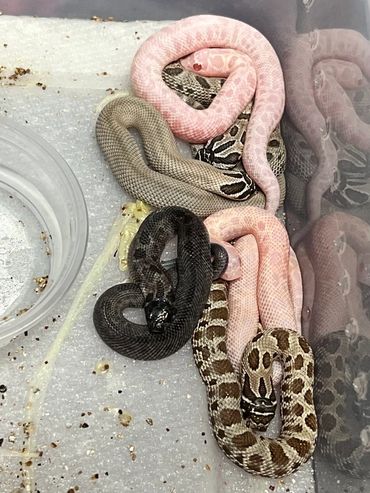 This year we paired Leia with Han, as we intended all along (hence their names). Both of them are grey fogs, 100% het albino. (Note: grey fog is arctic anaconda). Leia produced 10 small eggs, 1 of which never fully developed, and another one we lost right as they started to pip. After a month of trying to tend to him, we did end up losing the super arctic as well. The 7 that remained provided a fascinating variety, and we couldn't be happier with the results! We ended up with the final breakdown as: